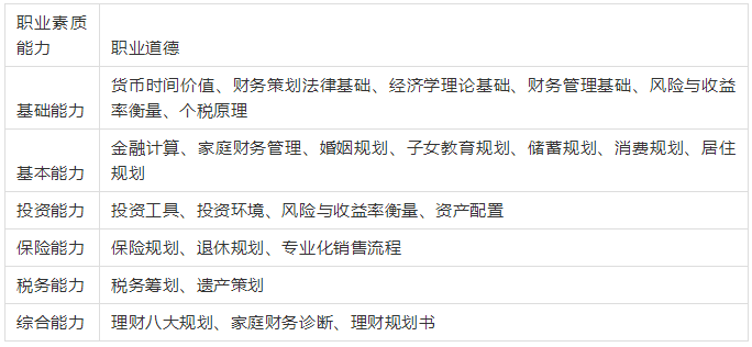 基础财务策划、投资策划、保险及退休策划、税务及遗产策划、高级财务策划。