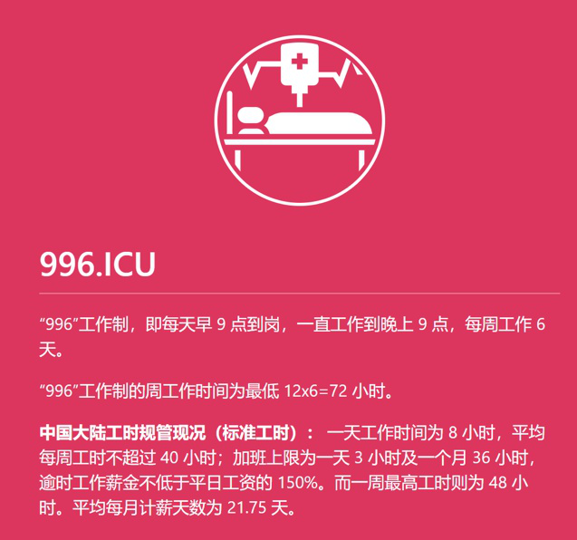 综合钛媒体、凤凰科技、界面新闻、上观新闻等[url=无力呐喊还是硬核反抗 18万人为996.ICU点赞背后: 会有怎样的结局? http://news.uc.cn/a_16802774999261374452/?from=UCPC]无力呐喊还是硬核反抗 18万人为996.ICU点赞背后: 会有怎样的结局? http://news.uc.cn/a_16802774999261374452/?from=UCPC[/url]