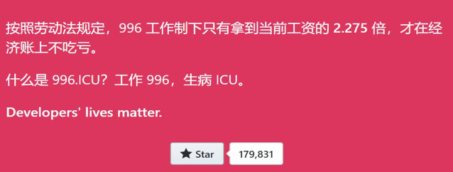 最近,国内程序员界发生了一件大事,有人在知名代码托管平台上发起了一个名为“996.ICU”的项目,以此抵制互联网公司超时工作。此举得到大批程序员响应。所谓“996”,是指每天上午9点工作到晚上9点,每周工作6天;而“996.ICU”,意为“工作996、生病ICU”。截至4月8日,“996.ICU”项目中已经有84家企业被列入加班“黑名单”。