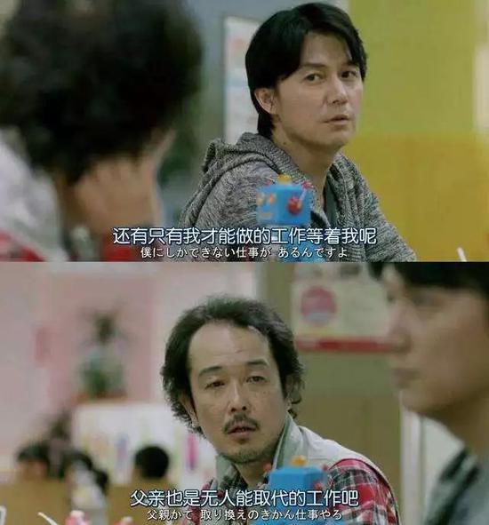 影片最后,两个父母在一起聊天,斋木说自己半年内陪庆多的时候比良多六年以来都要多。庆多理直气壮地回复:有工作在等着我呢。斋木顿了一下反问道:“父亲也是无人能取代的工作吧!”