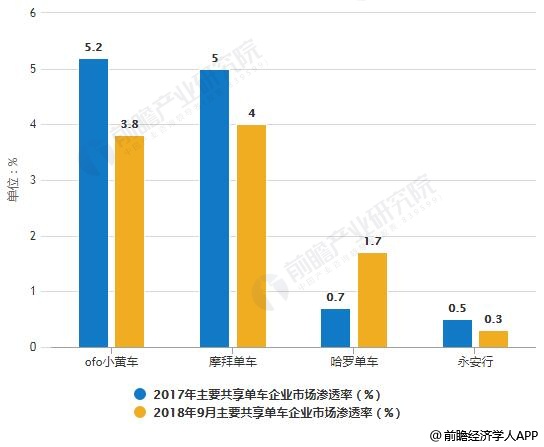 此外,哈罗单车、永安行也是业内排名靠前的企业,哈罗单车的市场渗透率升至1.7%;而永安行下降至0.3%。