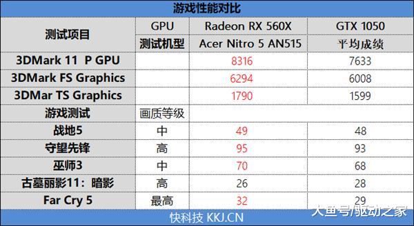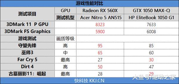 从测试成绩来看,RX 560在理论测试中同样是优于GTX 1050 MAX-Q,在游戏测试总,有3个项目中取得了领先,但是在《Fay Cry5》和《古墓丽影10:崛起》中要稍弱于对手,总体依然处于领先的地位。