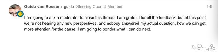昨日,Guido van Rossum 还是决定关闭该帖子,因为他认为目前的回答未能「听到任何新的观点」,且「没有人回答我的实际问题」,接下来他将「思考下一步能为此事做些什么」。