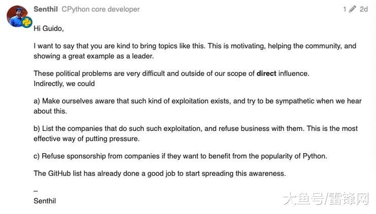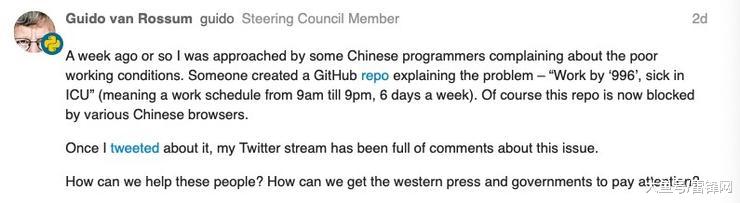 雷锋网(公众号:雷锋网) AI 科技评论按:996.ICU 事件进一步发酵,继上个月在推特上评论 996 制度「违反人性」后,「Python 之父」Guido van Rossum 近日再就此事于 Python 官方论坛发布一篇名为《Can we do something for 996 programmers in China?》(我们能为深陷「996」泥沼的中国程序员们做什么?)的帖子,引起网友热议。