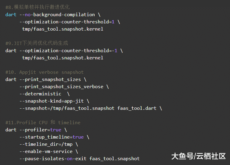 在前面我们提到过Dart版本的FaaS语言容器,为追求极致的研发体验,我们需要缩短用户Function打包到部署运行的时间。就语言容器层面而言,Dart提供的Snapshot技术可以大大提升启动速度,但是从用户Function到Snapshot(如下图)生成所产生的编译时间在不做优化的情况下超过10秒,还远远达不到极致体验的要求。我们这里通过一些测试,来寻找提升性能的途径