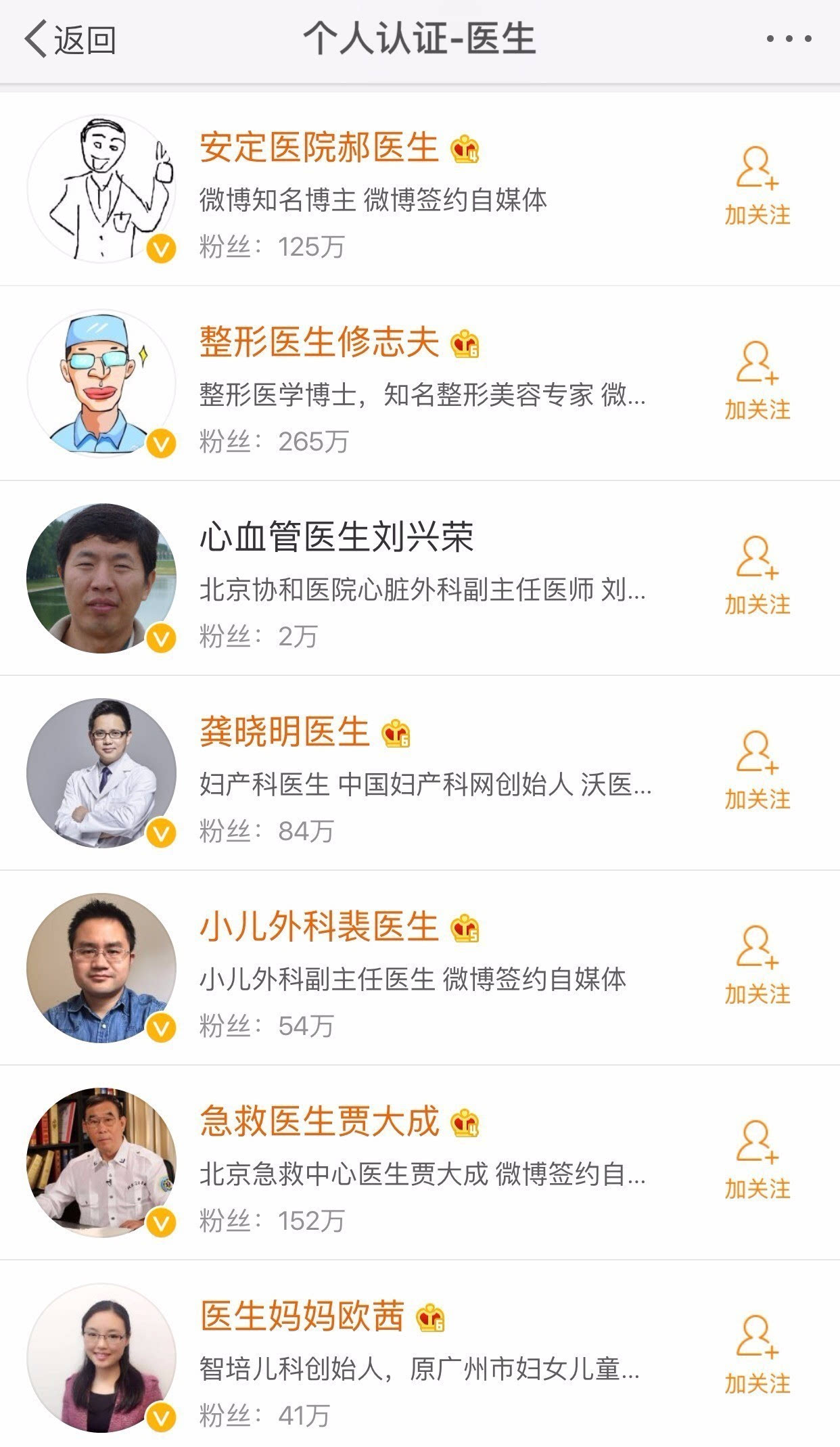 在确定目标用户聚集的平台之后,这一步需要把他们找出来。具体在执行过程中,可以摸索一些规律和技巧,常用的方法是从搜索、榜单和热门推荐里去找。下图是微博搜索「医生」,并且筛选出个人认证之后的结果;知乎的某个话题也有最佳回答者列表。