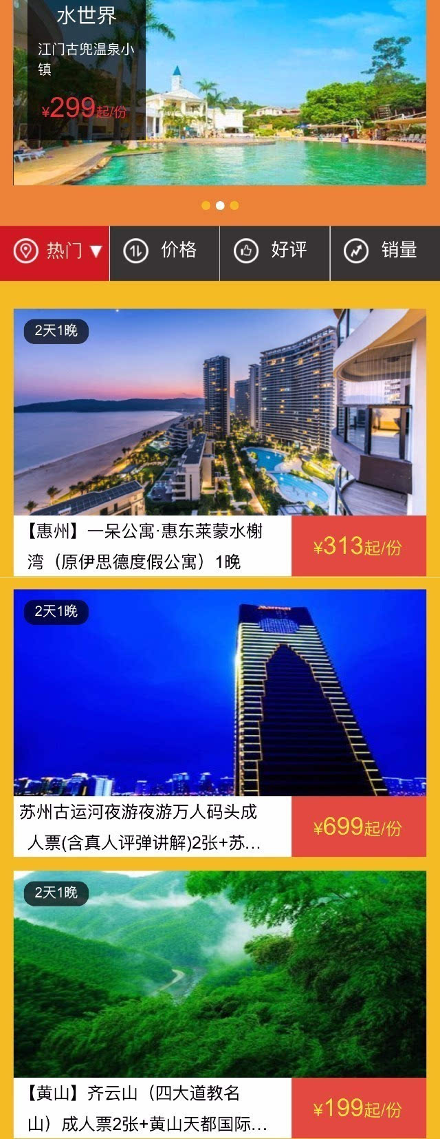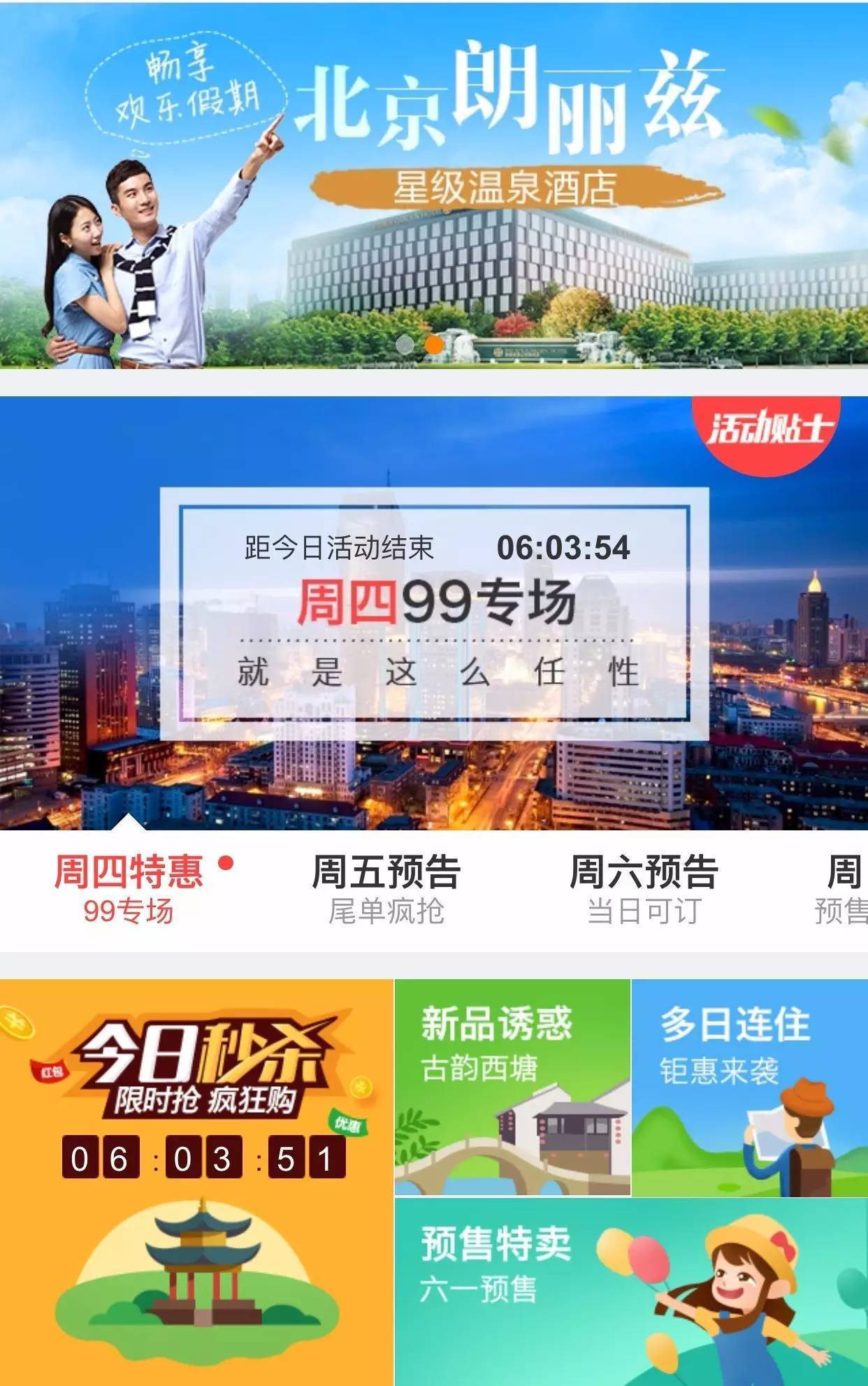 以一个旅游类O2O产品为例。打开这个app,有一个「周四99元专场」的活动非常显眼,就点进去看,如下图。