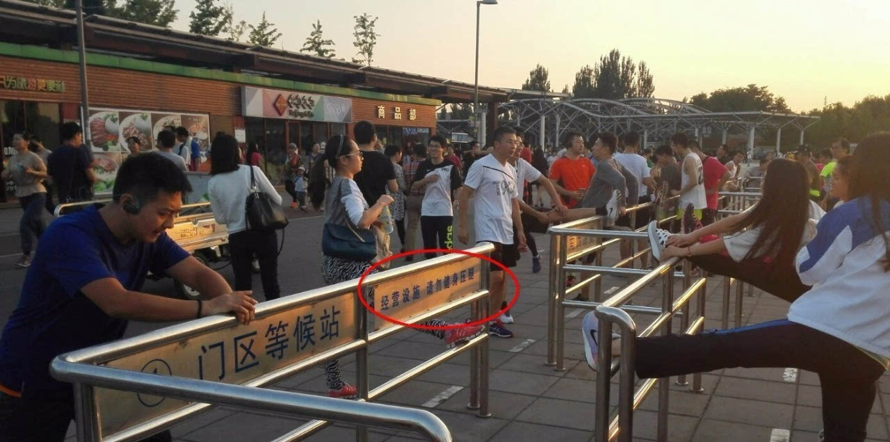 很多跑步爱好者在一组扶栏上压腿,做准备活动,但扶栏上却提示着「请勿健身压腿」。