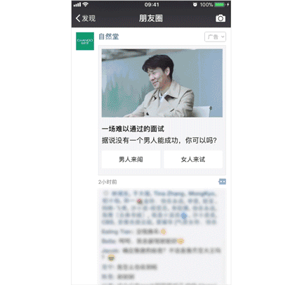 自然堂在3·8妇女节投放的朋友圈选择式卡片广告,关注中国职场女性困境,唤起了热烈讨论和主动分享,落地页进入率高于行业均值72%,社交分享产生的额外曝光高达8%。不仅很好地宣扬了品牌价值观,为品牌大量增粉,也体现出国货品牌的社会责任。