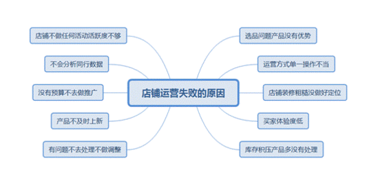 一个店铺运营为什么失败的?我大概总结了以下几点,如下图: