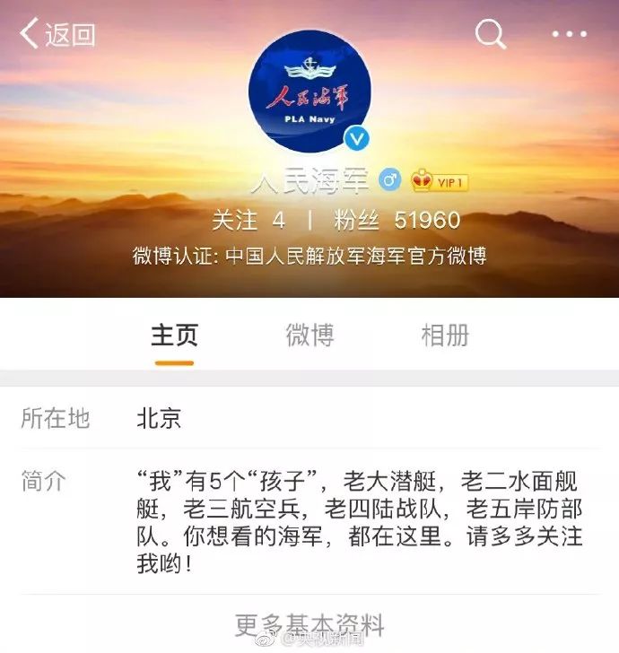 @人民海军 官方微博上线,其简介为:“‘我’有5个‘孩子’,老大潜艇,老二水面舰艇,老三航空兵,老四陆战队,老小岸防部队!”(央视新闻)