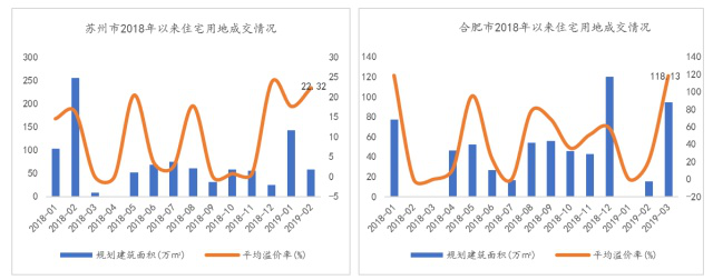 但其实,半年前,苏州土拍市场还有点冷,土地多低溢价成交,流拍频发,土地成交规模萎缩;2019年以来土地成交量回升,地块竞争激烈,2月苏州住宅用地溢价率达到了22.32%,土地市场回温明显。合肥土地市场也在经历了2019年1月、2月沉寂后,量价齐升,3月宅地溢价率飙升至118.13%。在合肥土地供应短缺、商品房库存量少去化周期短的情况下,房企预期有所转变,拿地热情升温。