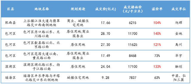 3月21日,合肥土拍6地收金124亿,参拍房企超过50家,房企拿地热情高涨,6宗地块有4宗溢价率超过100%。