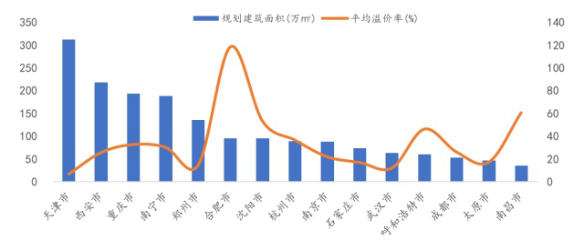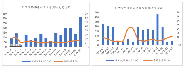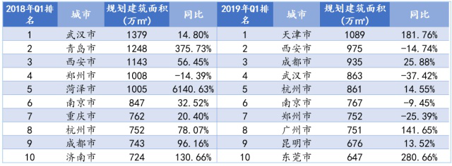 而2019年一季度榜单中上榜城市多为热点二线城市,如杭州、武汉、成都等,其中天津土地市场表现亮眼,规划建筑面积1089万平方米居首位,同比增长182%。