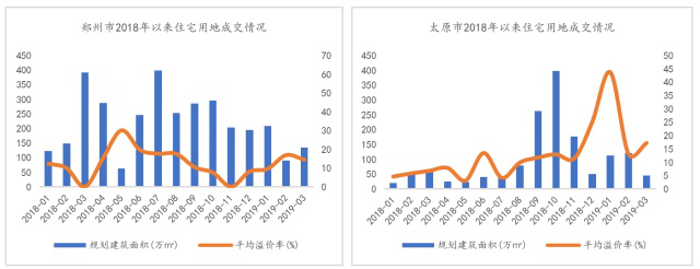15个代表二线城市3月份的成交情况来看,合肥土地市场以118.13%的溢价率遥遥领先于其他二线城市,杭州、沈阳等城市土地成交规模回升,溢价率上涨,回温显现;而天津、武汉等城市虽然土地成交规模较大,但溢价率一直在低位徘徊,3月份天津住宅成交的溢价率仅为6.85%,武汉住宅成交溢价率12.01%,土场竞争度较低;太原、郑州等城市政府推地规模大幅缩减,房企拿地意愿不够,土地市场表现冷淡,3月太原住宅成交溢价率17.19%,郑州住宅成交溢价率14.48%,远谈不上火热。