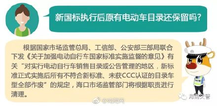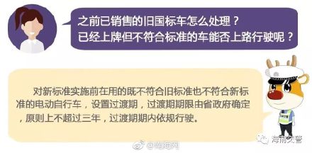 海南新闻[全面禁售超标电动车!新国标15日实施!原有电动车怎么办?交警回应]4月15日,《电动自行车安全技术规范》(新国标)正式实施。为推进新标准实施,近日,国家市场监管总局、工信部、公安部三部门联合发文,提出严管电动车生产、销售及使用行为。按照新国标,超标电动车届时一律不得生产、销售和上路。那么禁售之后,原有的已经上牌的车是否可以允许继续上路?对此,海南省公安厅交警总队进行了解答