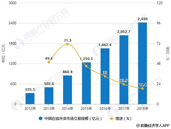据前瞻产业研究院发布的《中国在线外卖商业模式与投资战略规划分析报告》统计数据显示,2012-2017年中国在线外卖市场增速虽然有所放缓,但市场交易规模继续扩大。2012年中国在线外卖市场交易规模已达335.5亿元。并呈现逐年高速增长态势。2015年中国在线外卖市场交易规模突破千亿元。截止至2017年中国在线外卖市场交易规模增长至突破2000亿元,达到2052.7亿元,同比增长23.5%。初步测算到2018年我国在线外卖市场交易规模增速将会进一步放缓,但交易规模将达到2430亿元左右。随着在线外卖逐渐渗透到日常生活中,其市场交易规模已从爆发期过渡到稳定期,发展增速放缓,未来市场竞争将集中在服务体验和食品安全上。