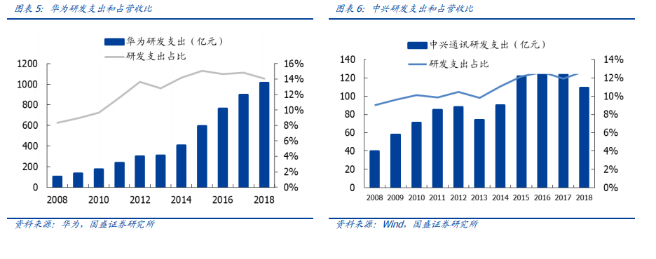 华为、中兴成“风向标”,带动国内自主创新步伐。根据华为 2018 年报,2008-2018 年华为累计研发投入大 4850 亿元。根据欧盟委员会的《2018 年欧盟工业研发投资排名》,华为的研发费用排名全球第五,已超越苹果。2017 年,中兴通讯的研发支出达到 130 亿元,占 A股通信全行业的 39%;2018 年中兴的研发支出占比提升至 13%,进一步蓄力 5G。