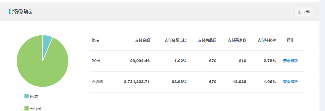 通过上述图片可以很明显的看出,店铺接近98%的支付金额来自于无线端,所以后期店铺投放过程中,主要是以无线端推广为主。,店铺PC端的支付转化也比较高,所以店铺可以做下PC端小位置小预算的推广。