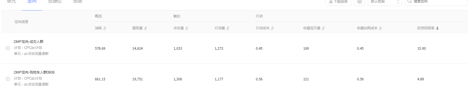现在cpc下的定向大多数都是可以使用的,根据店铺的实际情况去进行定向的选择即可。通过一段时间的定向投放,对定向进行了筛选:成交人群和购物车的人群。出价越高,能获取更多定向人群,点击率也会相应提升,在预算充足的前提下,适当的提高出价可以获得更优质的流量,且点击率相对更好。