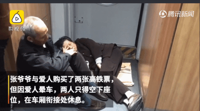 在怀化南至珠海的高铁上 一位阿姨躺在高铁两车厢衔接处 坐在一旁的老伴儿 一直在她身边