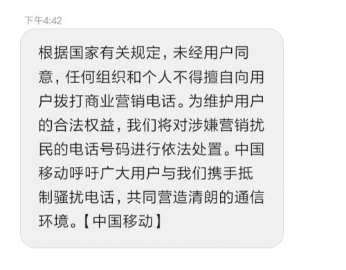 [techweb]4月15日techweb报道,下午4时42分,中国移动向用户发送了一条短信,内容为:根据国家有关规定,未经用户同意,任何组织和个人不得擅自向用户拨打商业营销电话。为维护用户的合法权益,我们将对涉嫌营销扰民的电话号码进行依法处置。