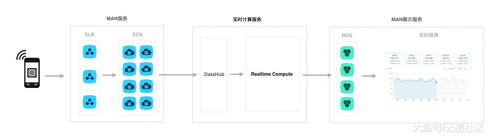 在流式处理部分,MAN采用阿里云实时计算作为底层的流式大数据分析引擎,为移动数据分析的客户提供一整套实时化的移动App分析报表服务。如下图。