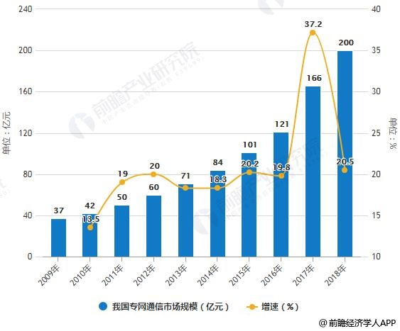 据前瞻产业研究院发布的《中国专网通信行业发展前景预测与投资战略规划分析报告》统计数据显示,2009年我国专网通信市场规模仅仅为37亿元。2011年我国专网通信市场规模达50亿元。到了2015年我国专网通信市场规模突破百亿元。截止至2017年我国专网通信市场规模增长至166亿元,同比增长37.2%。2009-2017年复合增长率达到20%以上。前瞻初步测算2018年我国专网通信市场规模达到200亿元左右。