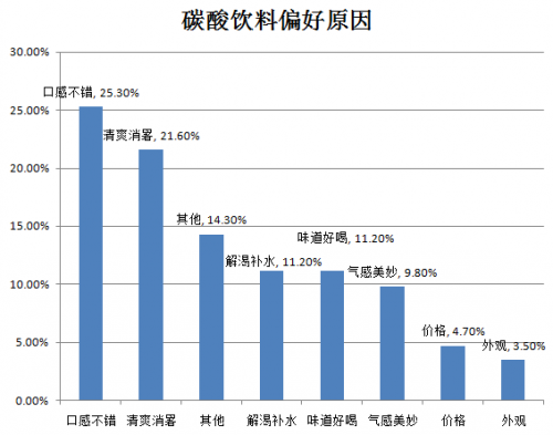 据《2016年中国碳酸饮料市场分析及预测》报告显示,青少年偏好碳酸饮料的原因主要其口感好,清爽消暑。