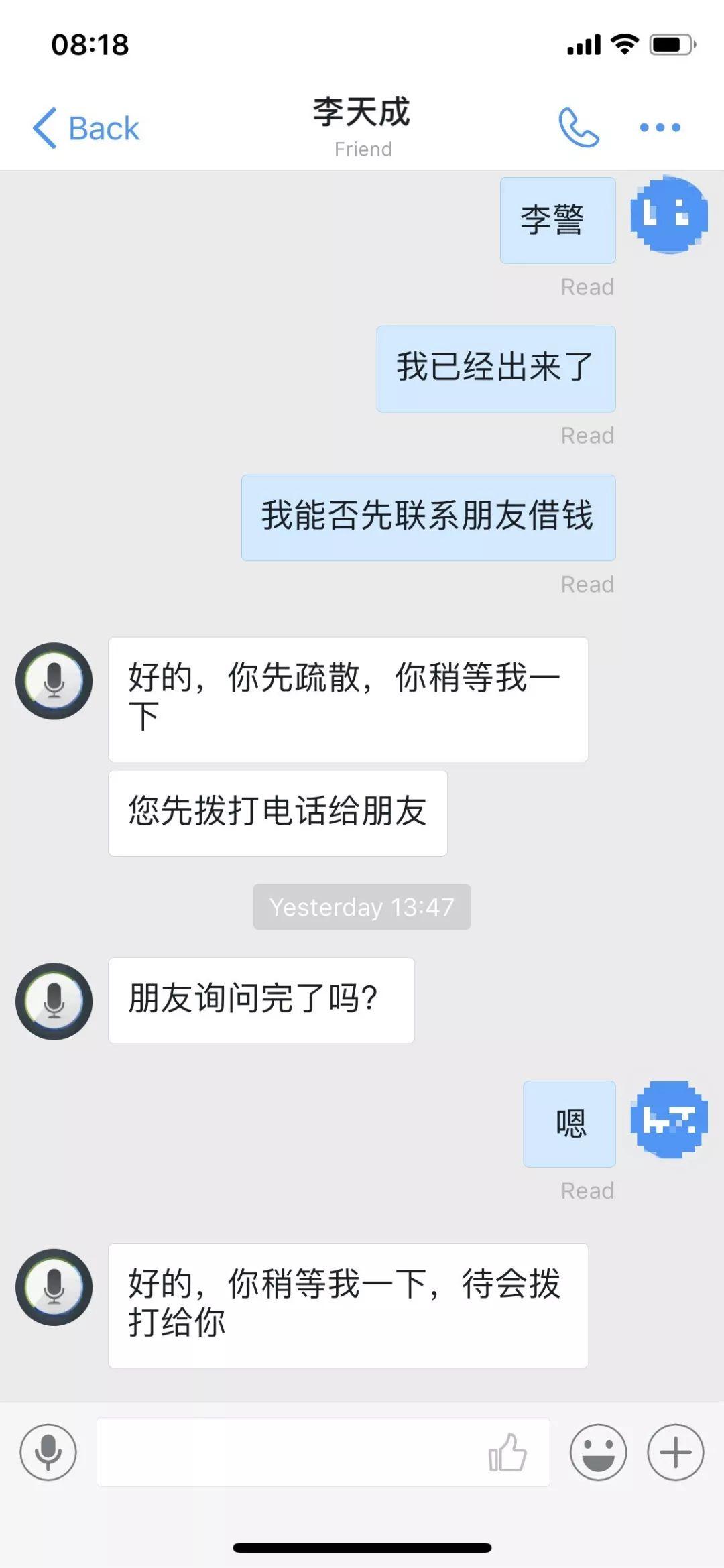 终于在通话四个小时后, 小胡和假警官的通话暂时挂断了。在疏散时,小胡看到了一个熟人 ,便借机问他借手机打国际电话给他爸。