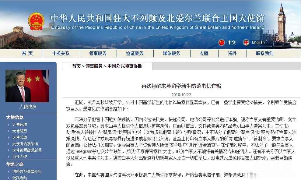 近期,针对中国留学生的电信诈骗明显增多。仅在去年下半年,中国驻英国大使馆就曾在去年的8月16日和10月22日,两次在大使馆的网页上发文提醒来英新生谨防电信诈骗,具体请查阅相关网页:http://www.chinese-embassy.org.uk/chn/lsfw/lsxz/。