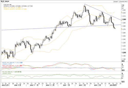 昨日黄金继续下跌,盘中试图收复1280美元但不成功,收盘于1273.7美元。