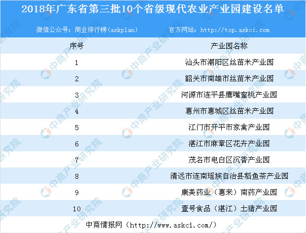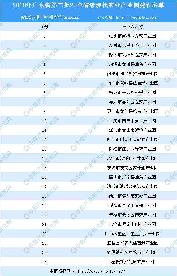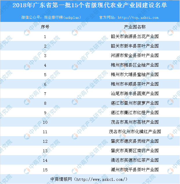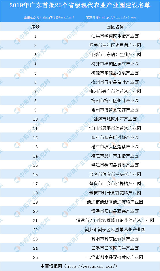 2019年,广东省公布了首批25个省级现代产业园名单,在2018年广东省也曾公布了3批省级现代农业产业园建设名单,2018和2019年一共公布了75个。其中,2019年首批25个,2018年第一批15个、第二批25个、第三批10个。其名单汇总如下:
