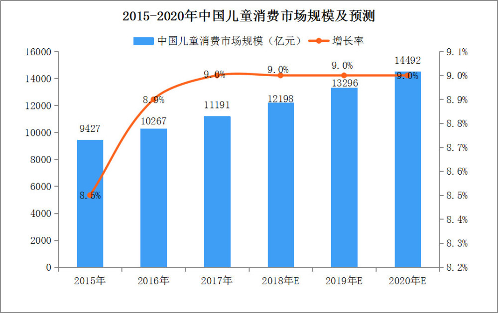 中国儿童消费市场规模不断增长,在2016年就已经突破了万亿大关,假设全国居民人均支出按9%增长,儿童支出占家庭支出的30%,则到2020年,幼儿大消费市场规模1.45万亿。