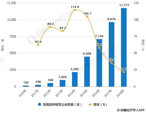 近8余年来,我国融资租赁业经历了快速发展,从2010年到2018年,融资租赁公司数量由2010年不足200家增加到2018的11777家,增长了近65倍。