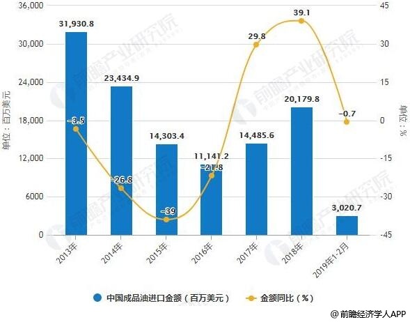 2013-2019年1-2月中国成品油进口量、金额统计及增长情况