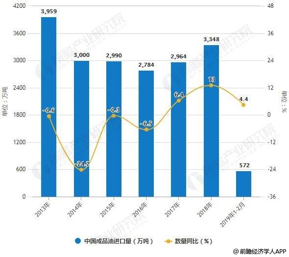 据前瞻产业研究院发布的《中国成品油行业市场调研与投资预测分析报告》统计数据显示,2013年-2016年中国成品油进口量下降,2016年中国成品油进口量相比2013年下降29.68%;2016年中国成品油进口量为2784万吨,同比下降6.5%。2017-2018年中国成品油进口量增长,2018年1-4季度中国成品油进口量逐渐增长,增长幅度逐渐加大。2019年2月中国成品油进口量为234.8万吨,同比下降11.2%。2019年1-2月中国成品油进口量为572万吨,同比增长4.4%。