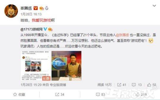 张腾岳自己经常在微博中透露自己是非常爱玩游戏。比如晒出自己很久之前的PSP,自述玩《生化危机2重制版》时的恐怖感受,甚至昨天还宣称送《刺客信条》的育碧就是自己大哥等等。而且他早在很久之前就自称自己是游戏肥宅,还与我们17173有着良好的微博互动。