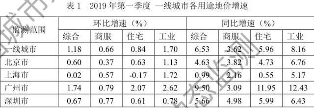 自然资源部17日发布“2019 年第一季度全国主要城市地价监测报告”显示,在一线城市中,北京、广州、深圳住宅地价增速环比收窄,上海住宅地价增速连续两个季度负增长。