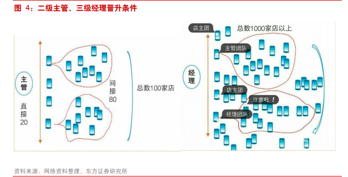 业务能力是成为二级主管的重要考核指标。一级会员要晋升为二级主管必须在营销能力方面满足三个条件,分别包括满足连续两个月销售额 3000 元以上、成交 20 单以上、直接或间接累积发展店铺 100 家,同时还需要依靠培训能力和经验竞聘上岗。在忠诚度方面,则要求主管连续有两个月以上的销售活跃度。