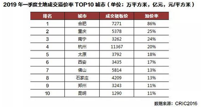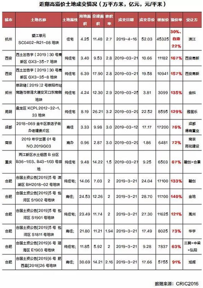 近期,西安、重庆、合肥等城市均成交了多幅高溢价地块,二线城市地市升温显著,暗藏过热的风险,杭州、合肥两城最为典型。4月16日,杭州成功出让主城7宗地,总成交价达126亿元,其中一幅位于望江的宅地,开拍不足20分钟,便达到封顶价45325元/㎡,仅次于2016年3月成交的杭政储出[2016]1号地(即凤起潮鸣项目)楼板价45409元/㎡,但加上自持22%,实际楼面价已经超过凤起潮鸣地块,成为杭州单价最贵宅地,地价不断创下新高。
