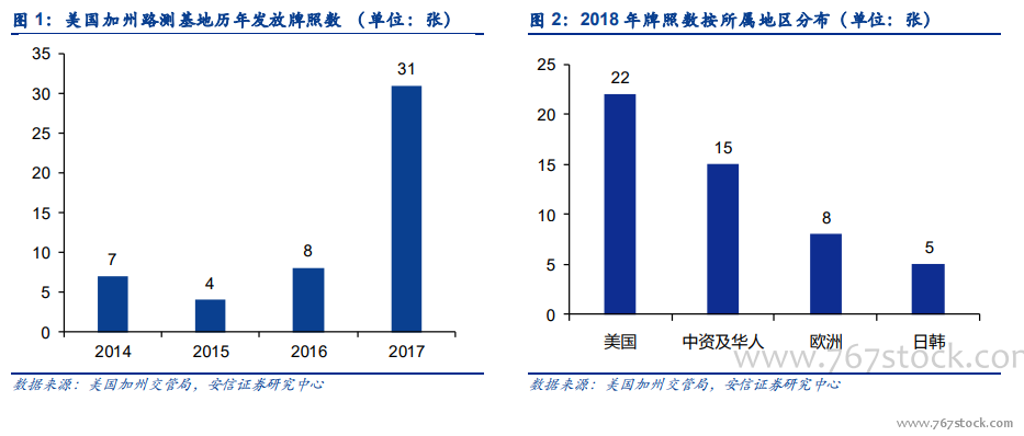 全球自动驾驶加速驶来。美国加州是全球首个通过无人驾驶汽车法规的地区,同时也是世界上最重要的无人驾驶测试基地,截至 2018 年 1 月,加州车辆管理局已发放 50 张无人驾驶测试牌照,其每年发布的脱离报告反应了全球自动驾驶的技术趋势和竞争格局。