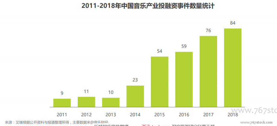 政策的利好使得音乐产业逐渐受到资本市场更多的关注。2014年,受互联网移动化趋势影响,移动端涌现出一大批新兴的音乐平台,导致音乐产业投融资数量有了首次明显的增长。而自2015年期间政策加强对音乐版权的监管以来,投融资事件的数量较2014年相比增长了接近一倍,达到54起。2017年5月,中共中央办公厅、国务院办公厅印发了《国家“十三五”时期文化发展改革规划纲要》,在《纲要》中首次将“音乐产业发展”列入到“重大文化产业工程”,从国家顶层设计上明确了音乐产业作为新兴战略文化产业的重要地位。同年,中国音乐产业投融资事件数量再次创造新高,根据音乐财经的梳理,只其中有6起投资事件金额在亿量级以上,资本的涌入将能够为音乐产业的创新与商业化发展带来更多活力。