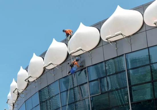 4月10日,在斯里兰卡科伦坡,工人清理莲花电视塔外立面。科伦坡莲花电视塔是中斯两国在“一带一路”建设中的重要合作项目。塔高350米,是迄今南亚最高的电视塔。图/新华