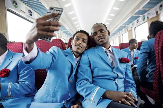 2016年10月5日,亚吉铁路工作人员在开通的火车上。当日,由中国企业采用全套中国标准和中国装备建造的非洲第一条现代电气化铁路——埃塞俄比亚首都亚的斯亚贝巴至吉布提首都吉布提铁路(亚吉铁路)正式通车。图/IC