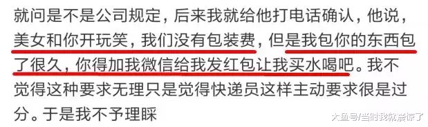 不过虽说没有额外费用,但是快递员还想加女生微信,让她看在自己辛苦“包东西包了很久的份上”,给他发个红包买水喝。