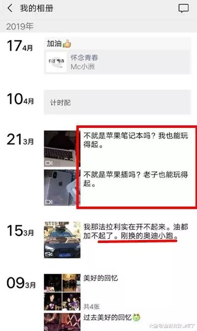 另外几条朋友圈虽然没拆快递的东西,但能明显看出这人的虚荣来,他说自己不开法拉利了,换了个“奥迪小跑”。