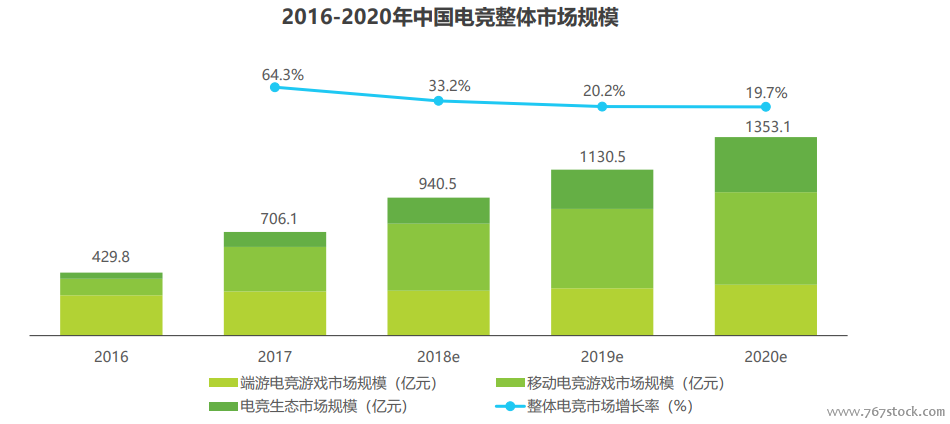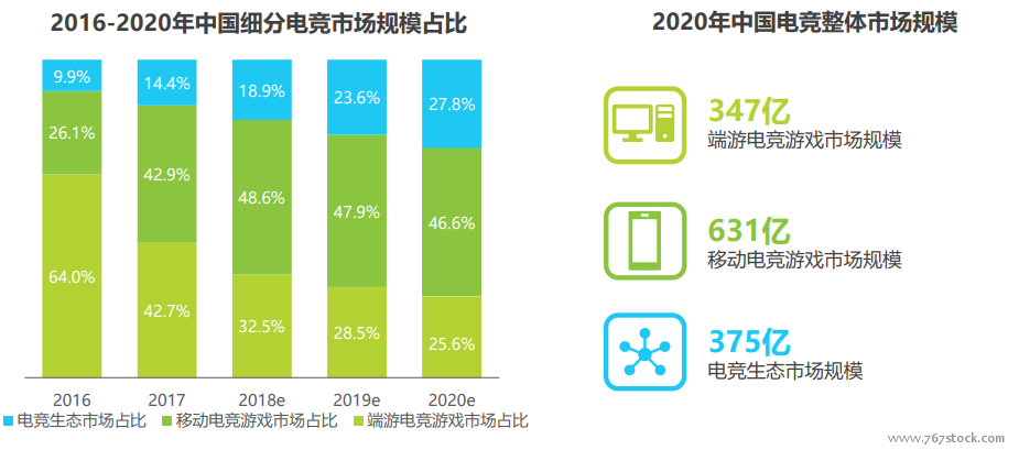 电竞生态市场规模迅速提升。从整体中国电竞市场的变化中可以看到,电竞游戏收入仍将在未来一段时间内是电竞市场的主要收入来源。尽管如此,中国电竞生态市场仍在持续提高占比。预计在2020年时中国电竞生态将占据27.8%的中国电竞市场份额。