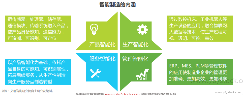 企业实现生产、管理、服务、产品智能化的全新生产方式。“智能制造”这一概念最早由美国学者P.K.Wright和D.A.Bourne在其著作《Manufacturing Intelligence》中出现,他们将智能制造定义为机器人应用制造软件系统技术、集成系统工程以及机器人视觉等技术,实行批量生产的系统性过程。工信部出台的《智能制造发展规划(2016-2020年)》中,将智能制造定义为基于新一代信息通信技术与先进制造技术深度融合,贯穿于设计、生产、管理、服务等制造活动的各个环节,具有自感知、自学习、自决策、自执行、自适应等功能的新型生产方式。