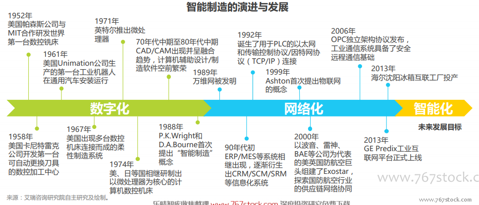 起源:数字化制造 成长:网络化制造 目标:智能化制造。智能制造代表着先进制造技术与信息化的融合,尽管概念提出至今仅30年的时间,但智能制造的起源可以追溯至上世纪中叶,其发展与演进可以大致分为三个阶段:从上世纪中叶到90年代中期的数字化制造,以计算、通讯和控制应用为主要特征;从上世纪九十年代中期发展至今的网络化制造,伴随着互联网的大规模普及应用,先进制造进入了以万物互联为主要特征的网络化阶段;当前,在大数据、云计算、机器视觉等技术突飞猛进的基础上,人工智能逐渐融入制造领域,先进制造开始步入以新一代人工智能技术为核心的智能化制造阶段。但受限于人工智能技术的发展水平与制造业应用尚未成熟,目前的“智能制造”还远未达到“自适应、自决策、自执行”的完全智能化阶段,智能化制造仍是未来的主要发展目标。